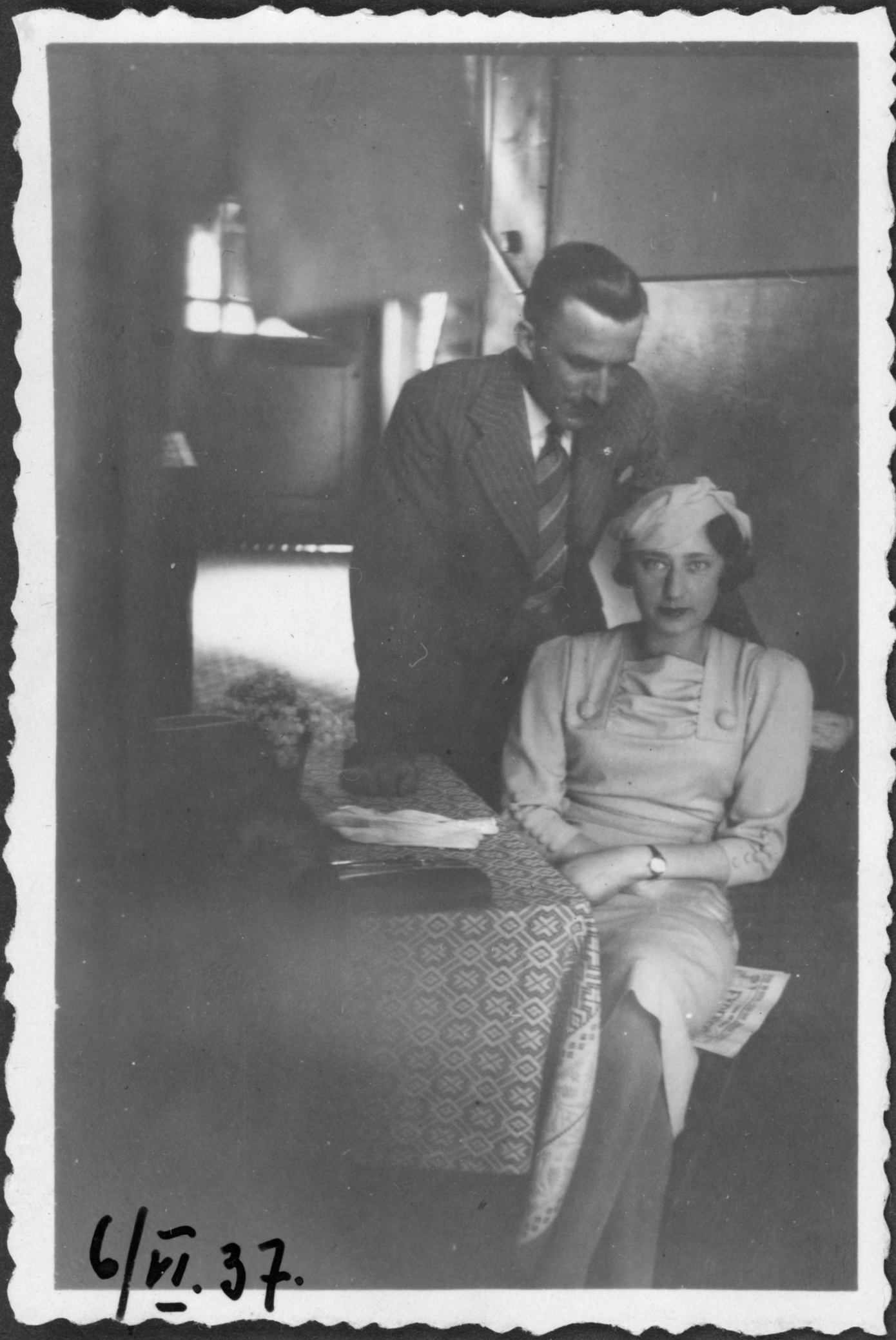 • kobieta ; mężczyzna ; pokój ; stół ; krzesło ; zegarek ; obrus ; rękawiczki ; torebka