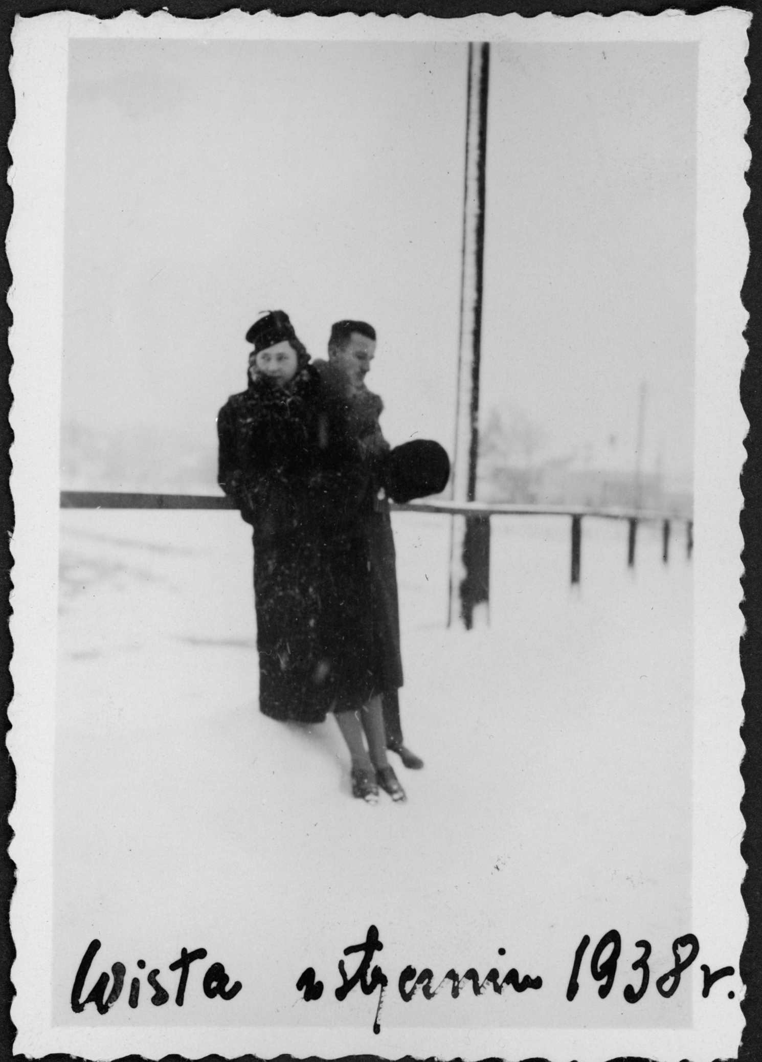 • kobieta ; mężczyzna ; barierka ; droga ; futro ; płaszcz ; czapka ; słup telefoniczny ; zima