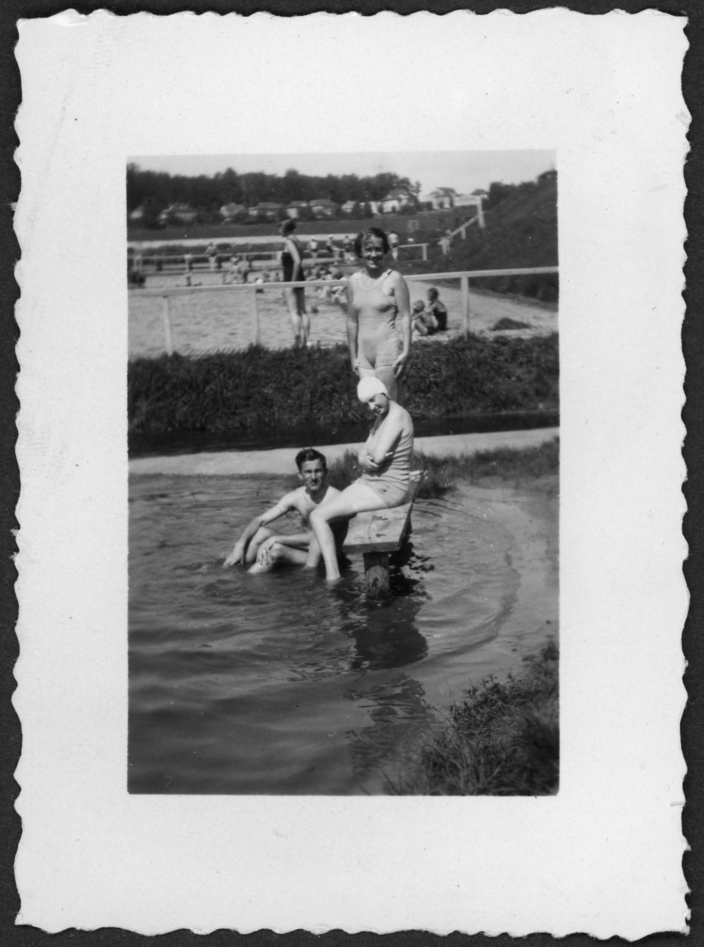 • kobieta ; mężczyzna ; łazienki rzeczne w Poznaniu ; Warta ; strój kąpielowy ; czepek pływacki ; pomost ; zabudowania ; las