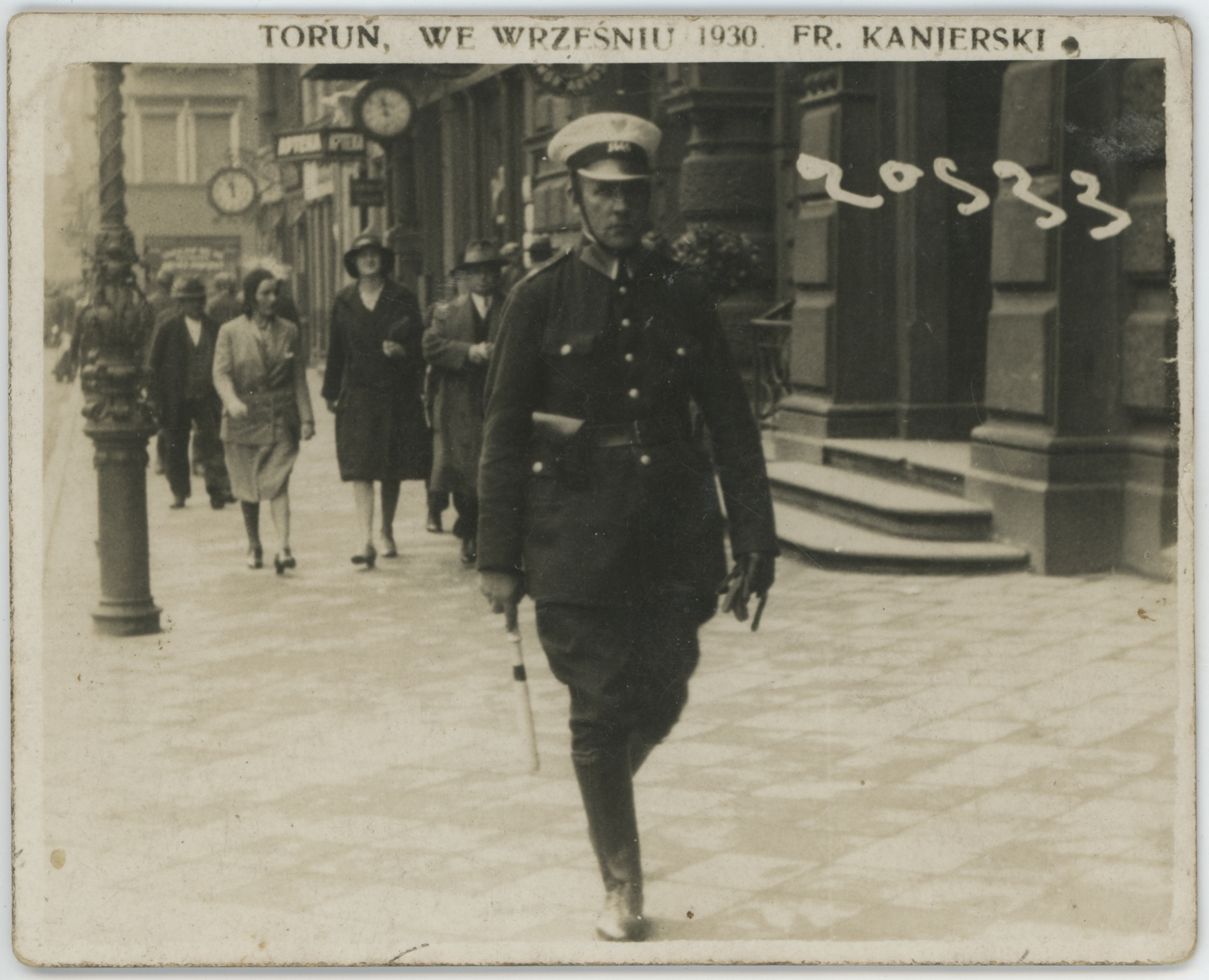 • fotografia ; portret ; mężczyzna ; policja ; policjant ; mundur ; mundur policyjny ; moda międzywojenna ; Dwór Artusa w Toruniu ; Rynek Staromiejski w Toruniu