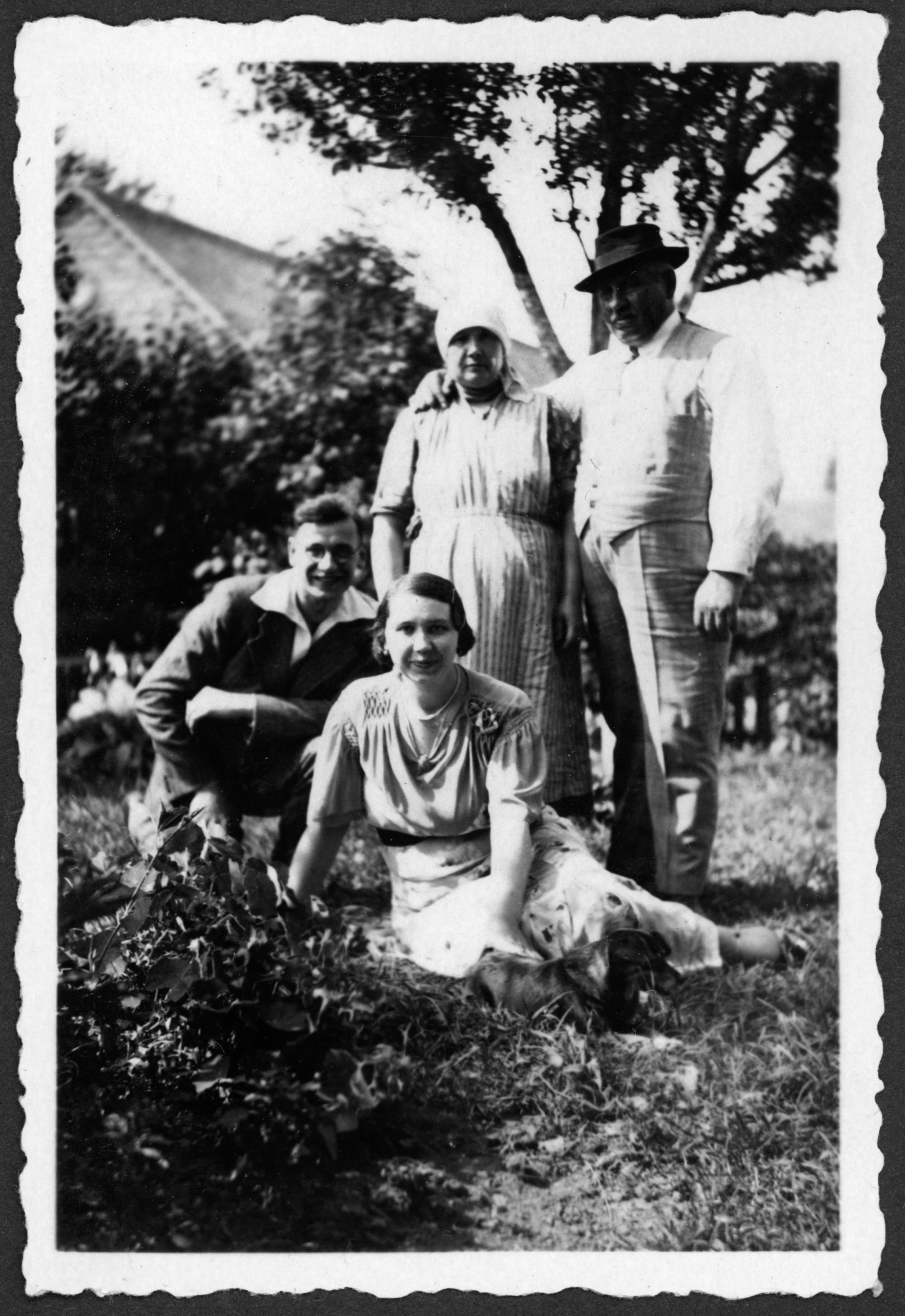 • fotografia ; portret ; kobieta ; mężczyzna ; okulary ; kapelusz ; ogród ; drzewo ; budynek