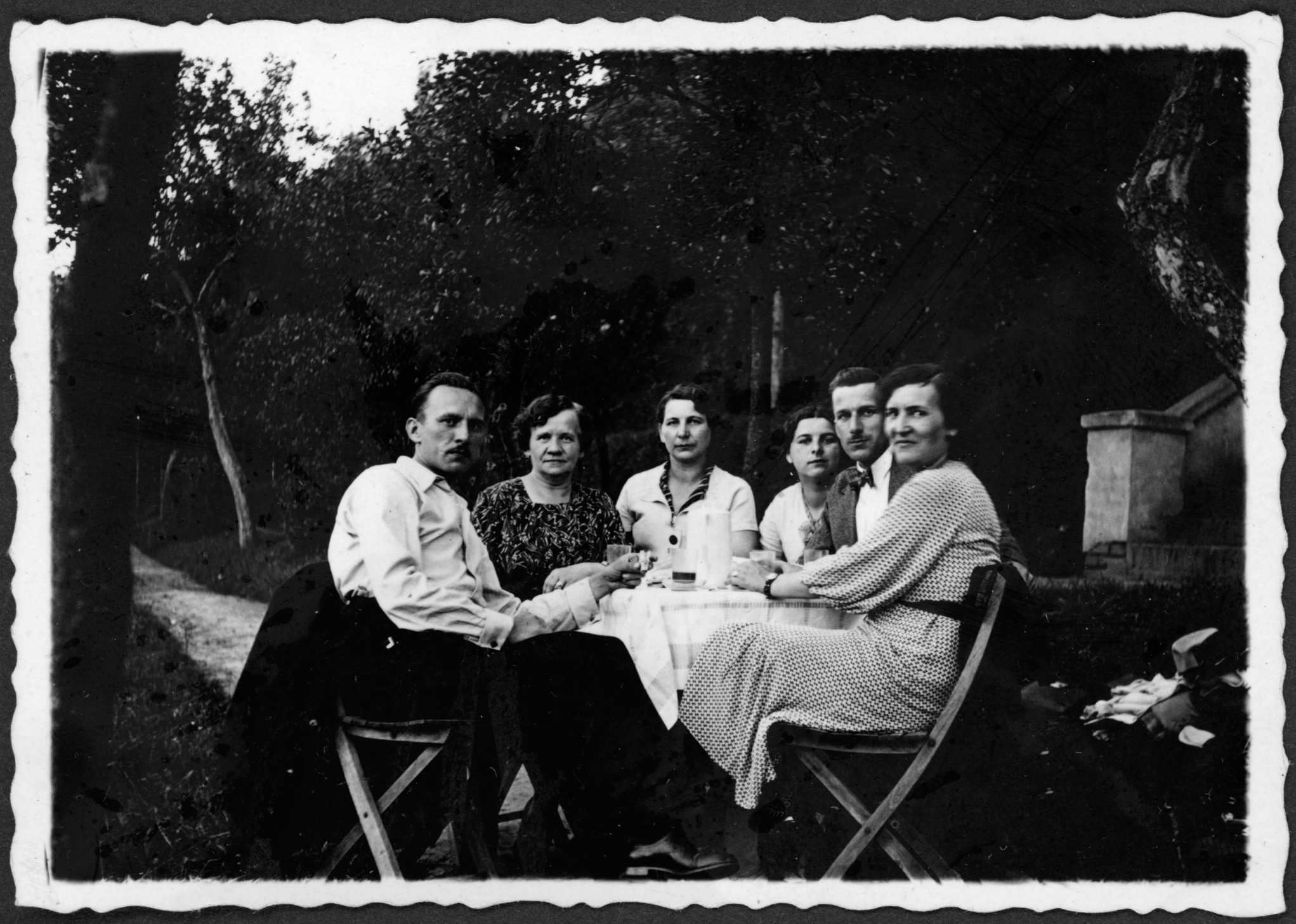 - fotografia ; kobieta ; mężczyzna ; stolik ; szklanka ; dzbanek ; balustrada ; schody ; plener