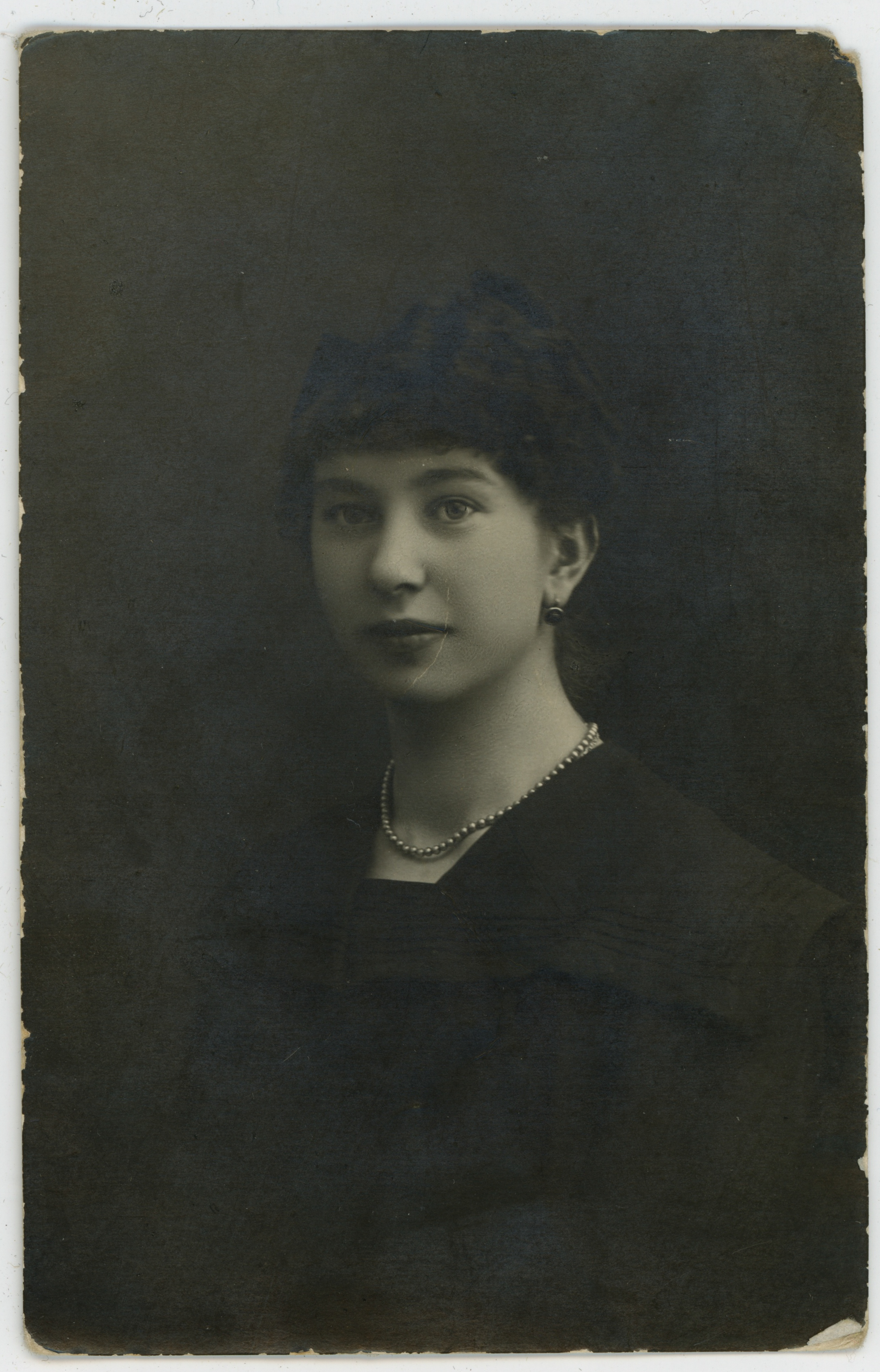• fotografia ; portret ; kobieta ; naszyjnik ; kolczyki ; zakład fotograficzny ; atelier fotograficzne