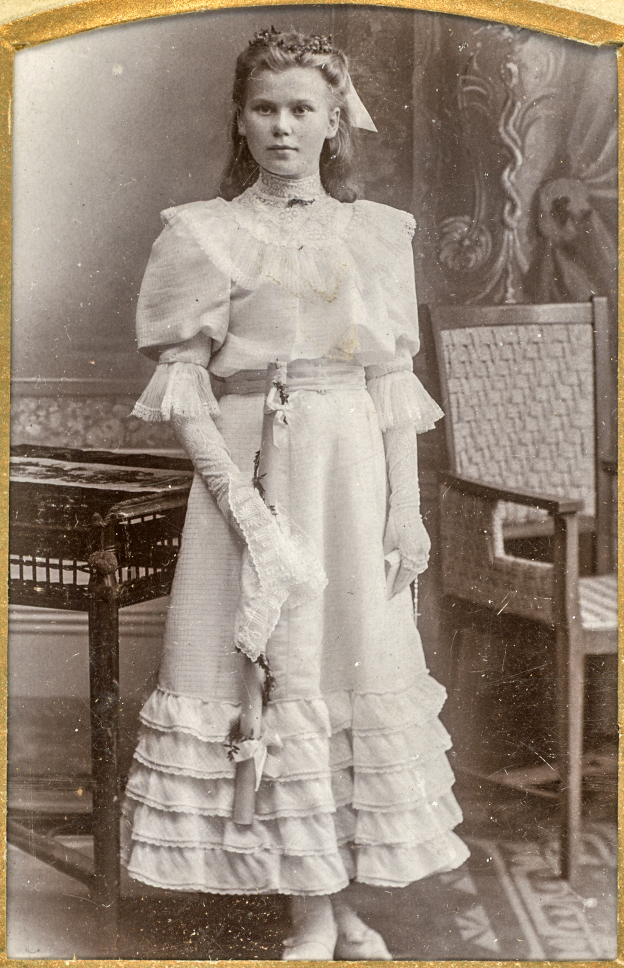 • fotografia ; portret ; atelier fotograficzne ; dziewczynka ; moda ; moda przełomu XIX i XX w. ; religia ; chrześcijaństwo ; katolicyzm ; I Komunia Święta