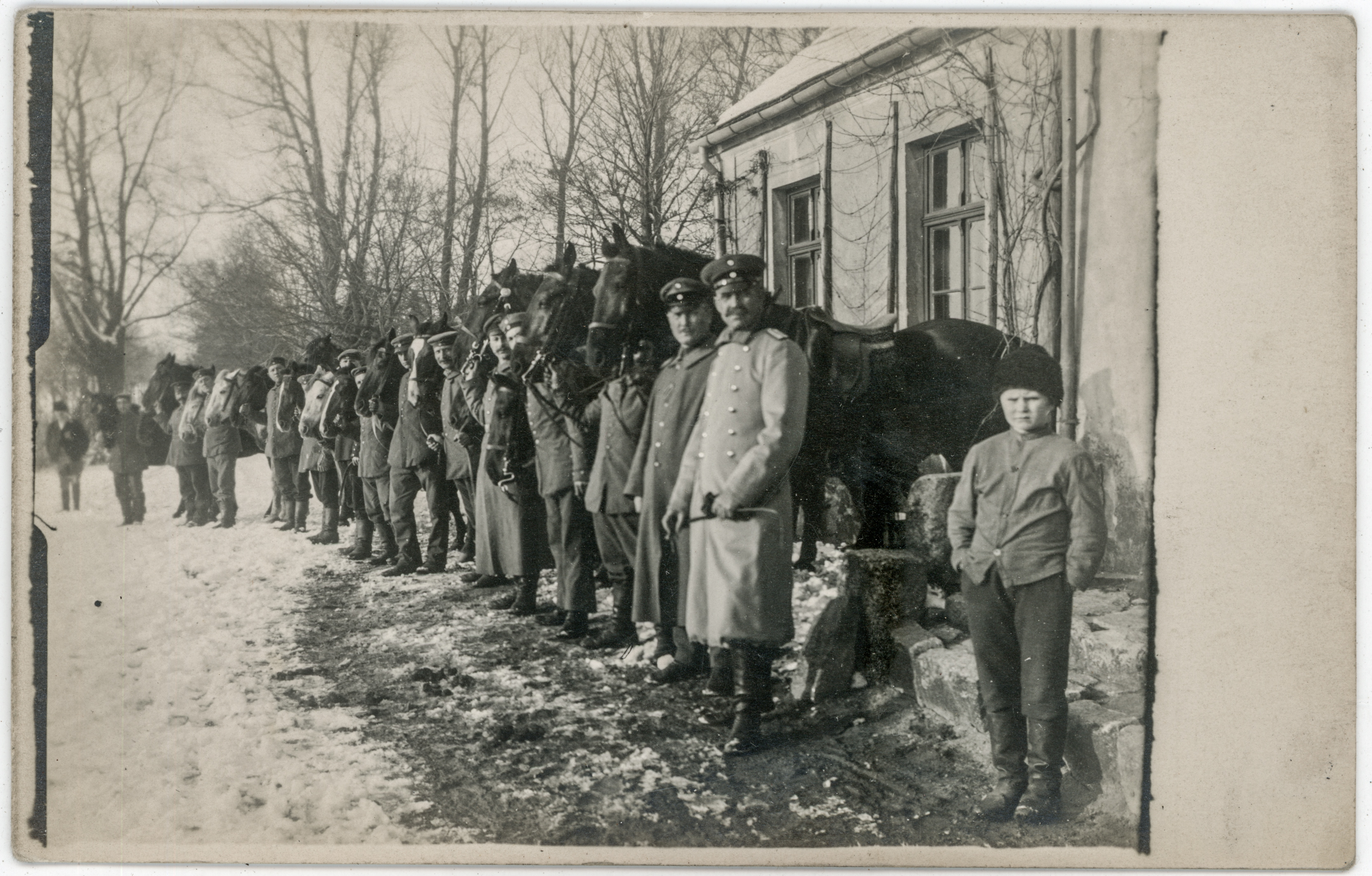 • fotografia ; chłopiec ; żołnierz niemiecki ; żołnierz pruski ; oficer ; mundur ; mundur wojskowy ; koń ; budynek ; dworek