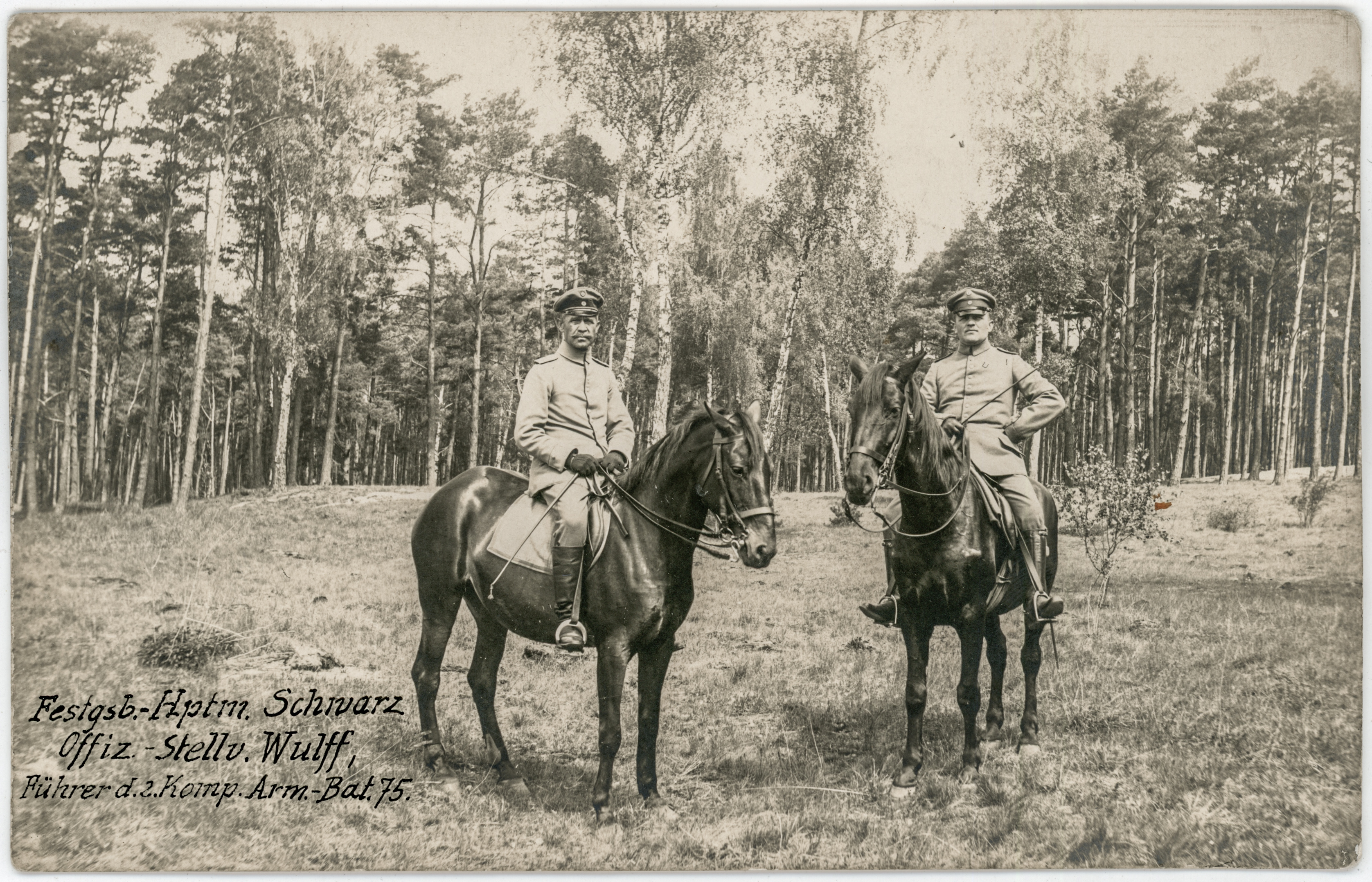 - fotografia ; żołnierz ; żołnierz niemiecki ; żołnierz pruski ; oficer ; kapitan ; mundur ; mundur wojskowy ; 2. kompania ; 75. Batalion ; koń ; las