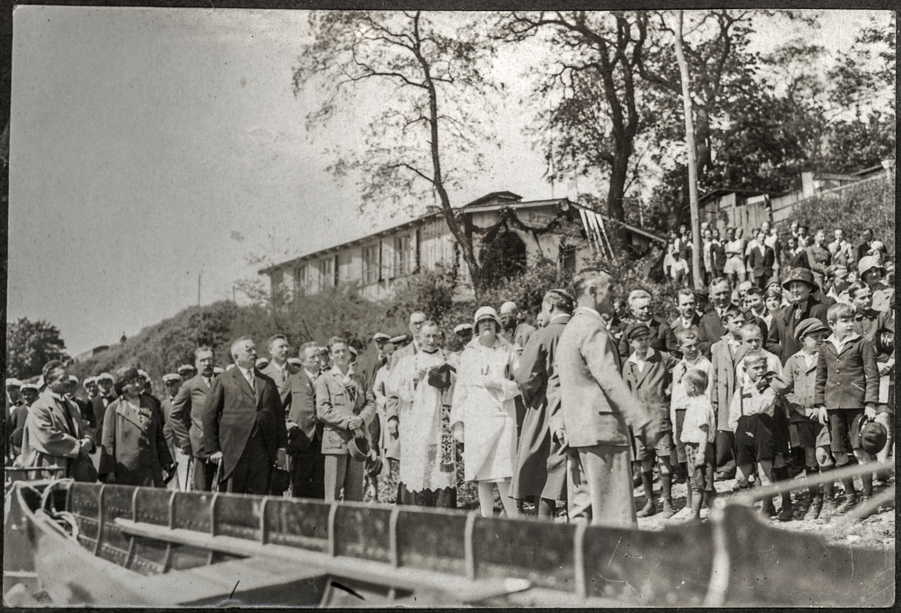 - fotografia ; kobieta ; mężczyzna ; dziecko ; ksiądz ; uroczystość ; łódka ; rzeka ; brzeg ; budynek