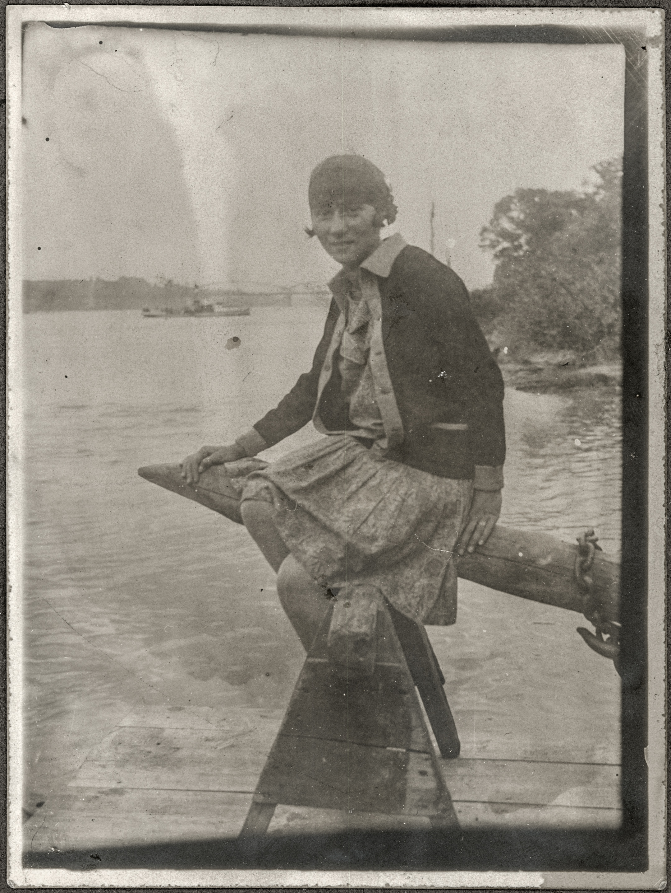 • fotografia ; dziewczyna ; pomost ; Wisła ; rzeka ; statek ; most ; most kolejowy w Toruniu