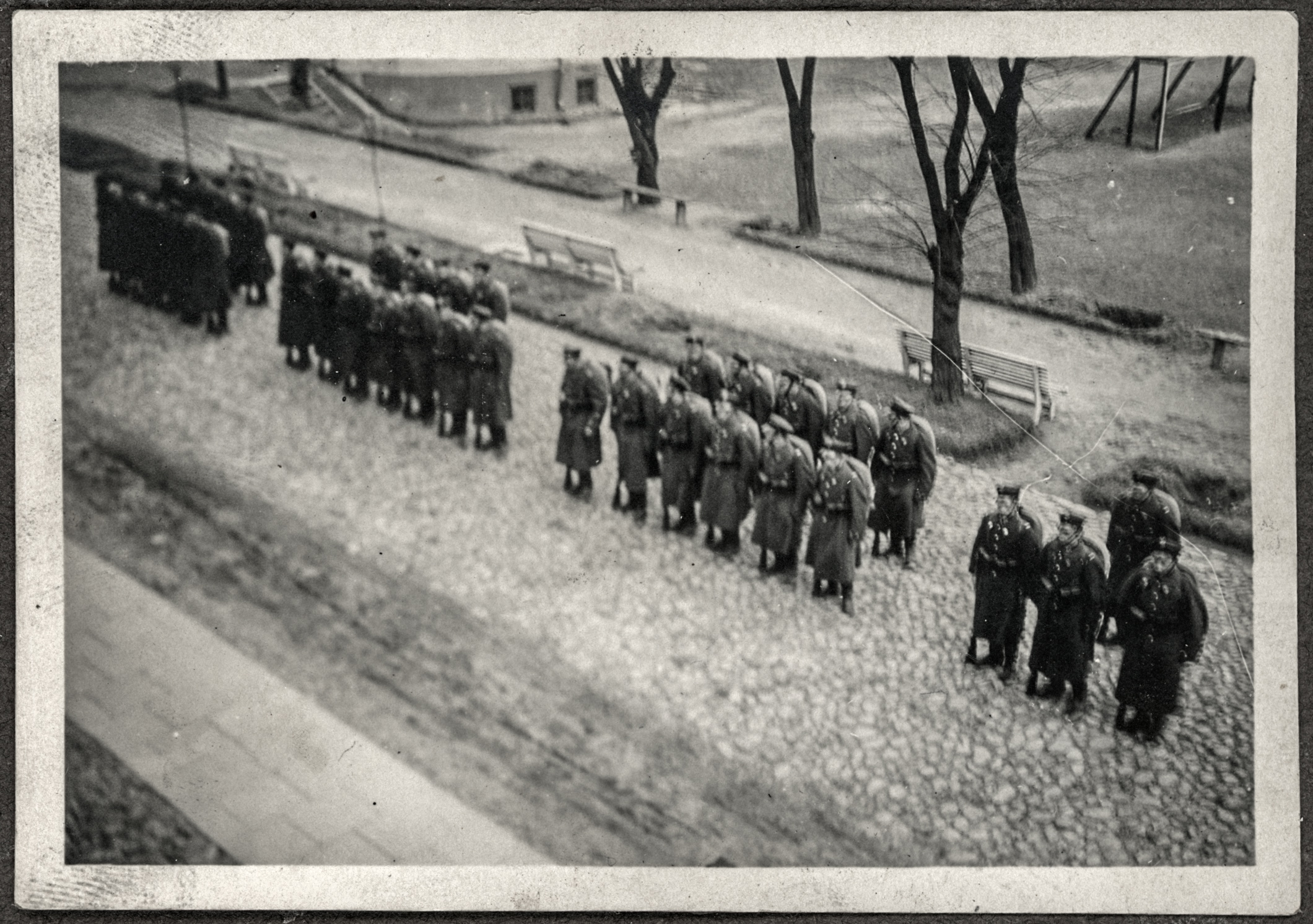 • fotografia ; żołnierz ; żołnierz polski ; mundur ; mundur wojskowy ; mundur wojska polskiego ; wojsko polskie ; musztra ; budynek