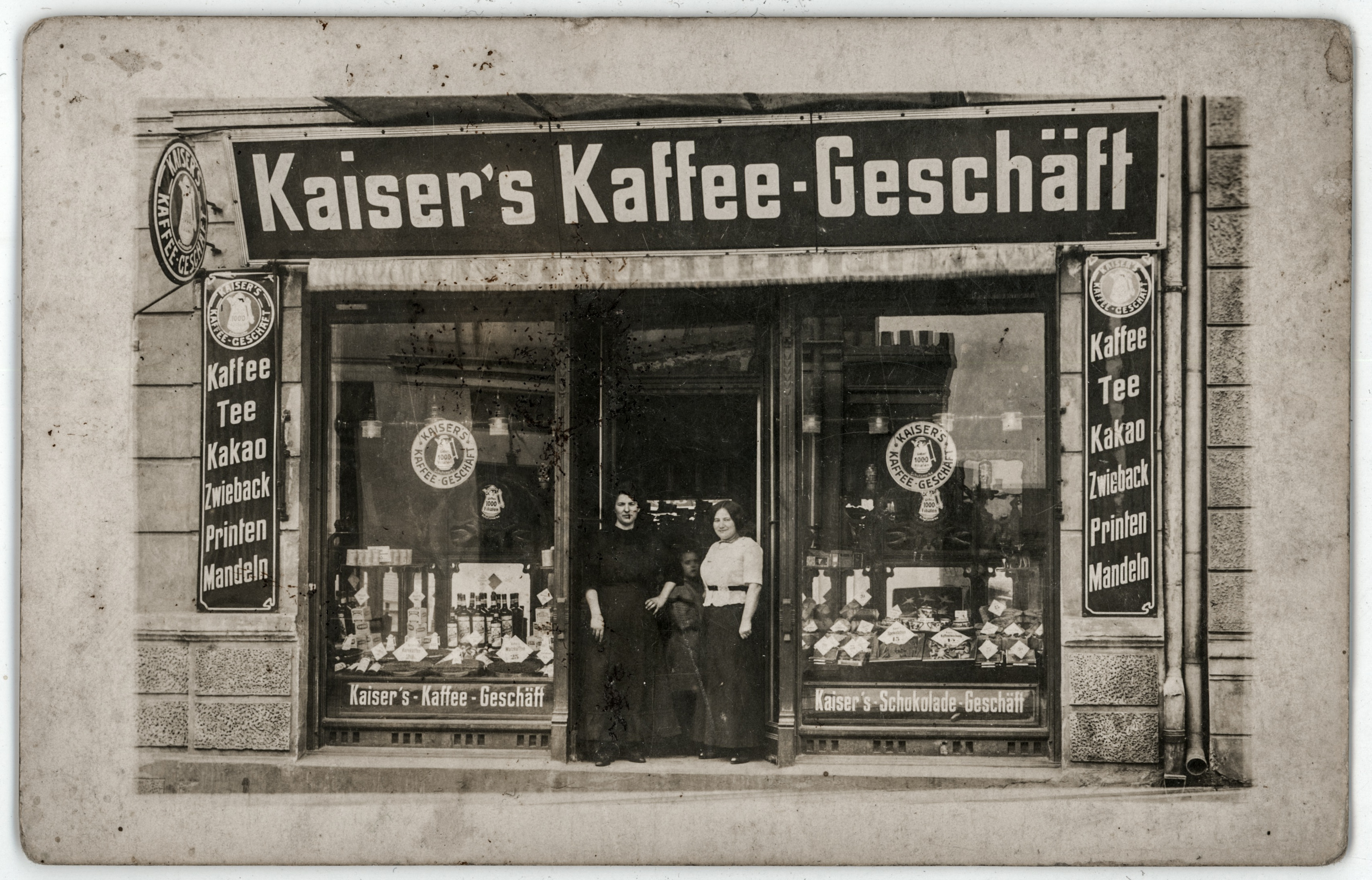 • portret ; kobieta ; dziewczynka ; moda ; moda okresu I wojny światowej ; kawiarnia ; kawa ; sklep ; wystawa sklepowa ; witryna sklepowa