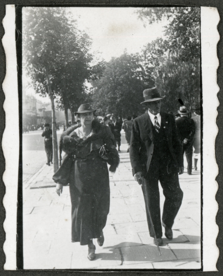 - fotografia ; kobieta ; mężczyzna ; spacer ; ulica ; miasto ; zabudowania
