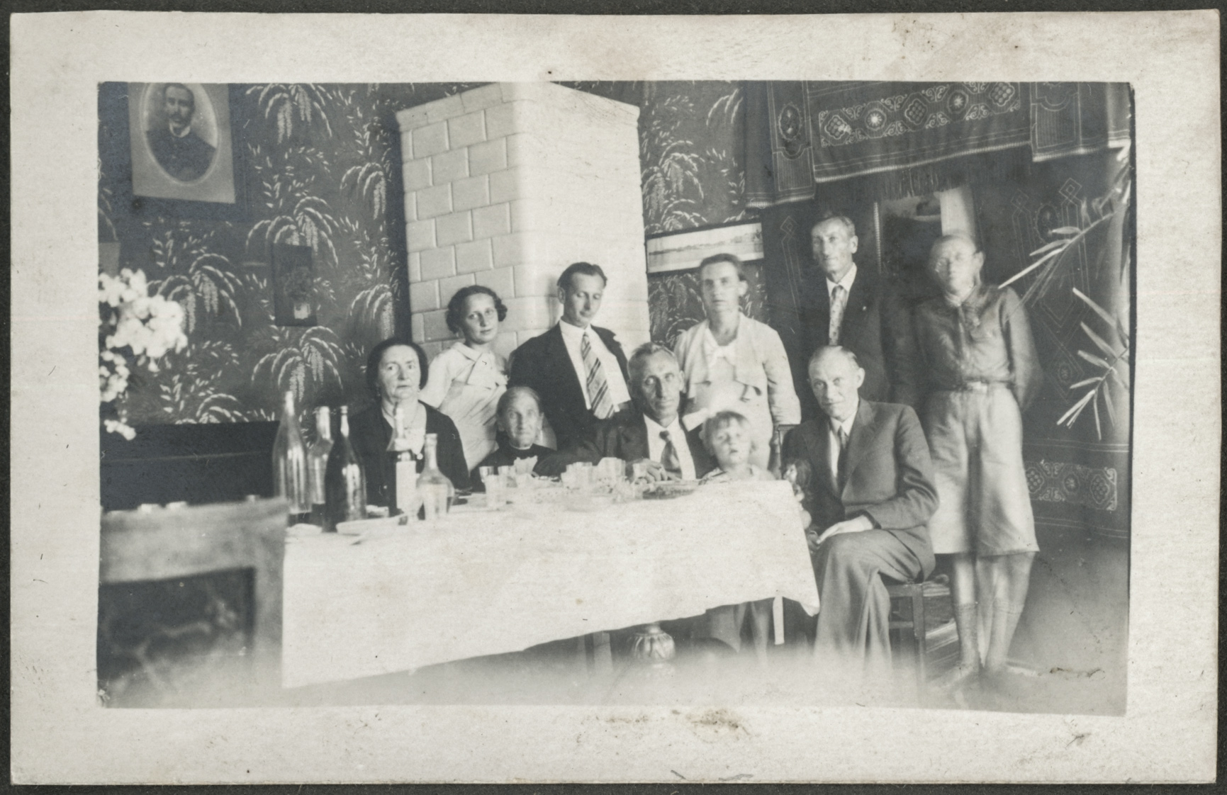 - fotografia ; kobieta ; mężczyzna ; dziewczynka ; rodzina ; portret ; stół ; piec kaflowy ; pokój