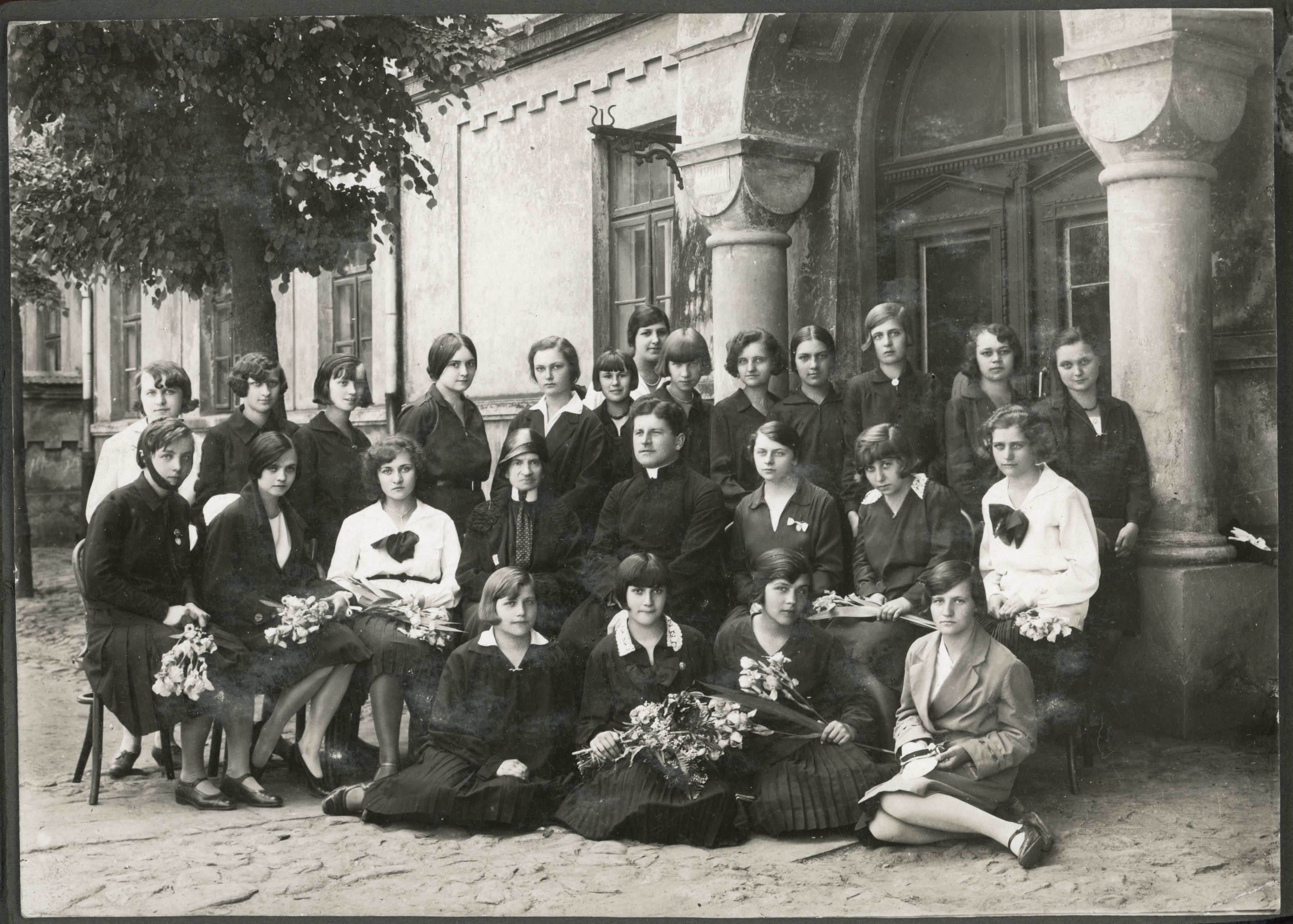 • fotografia ; dziewczyna ; ksiądz ; kwiaty ; budynek