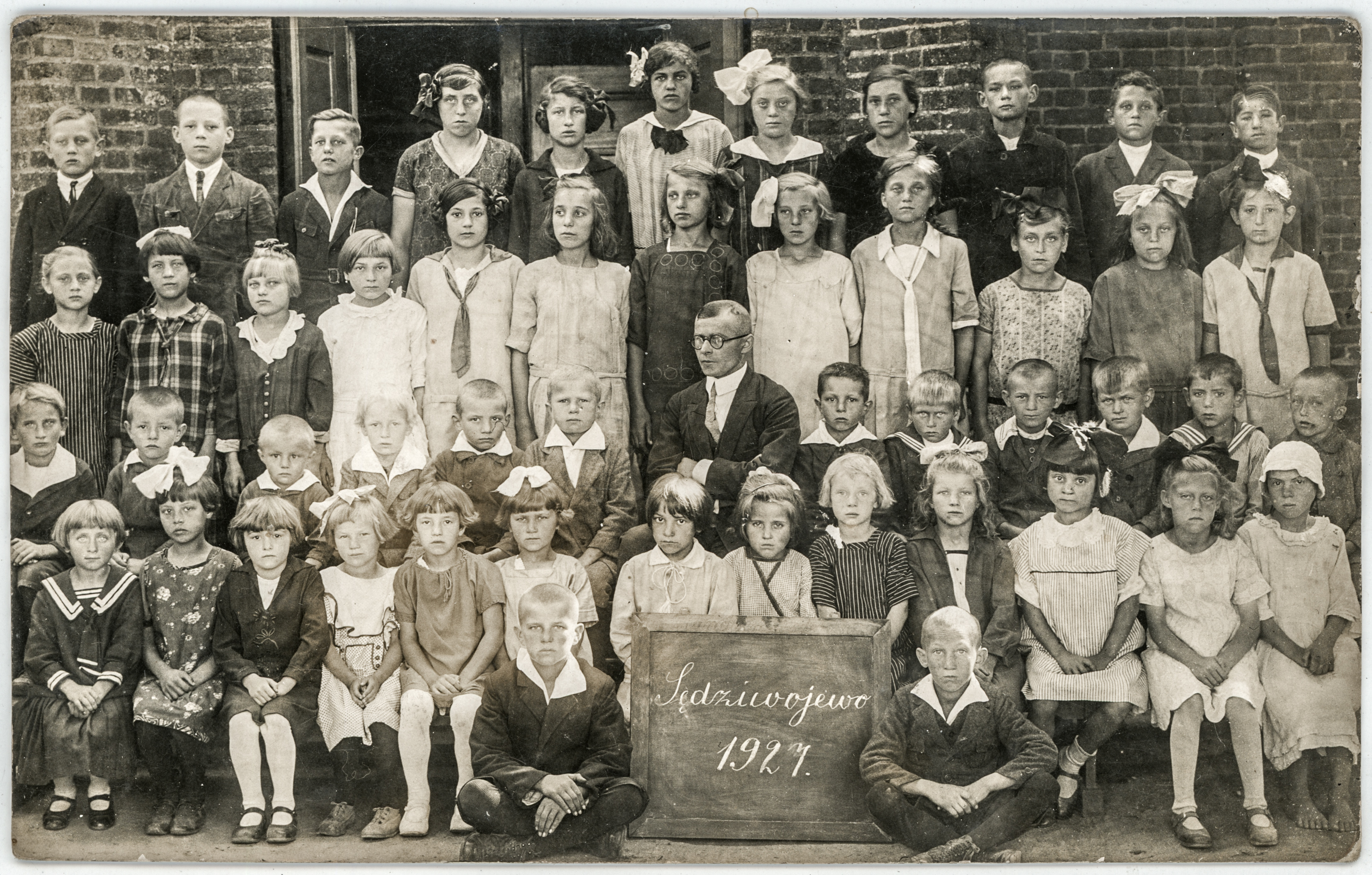 Uczniowie wiejskiej szkoły w Sędziwojewie wraz z nauczycielem Józefem Mikołajczakiem