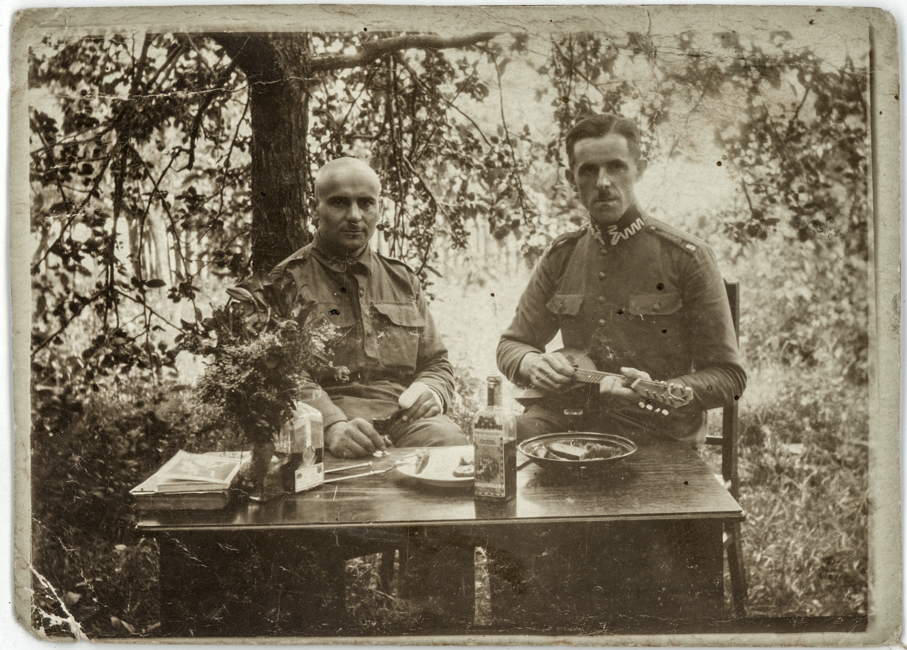 • fotografia ; portret ; mężczyzna ; żołnierz ; mundur wojskowy ; naczynie ; instrument ; lutnia