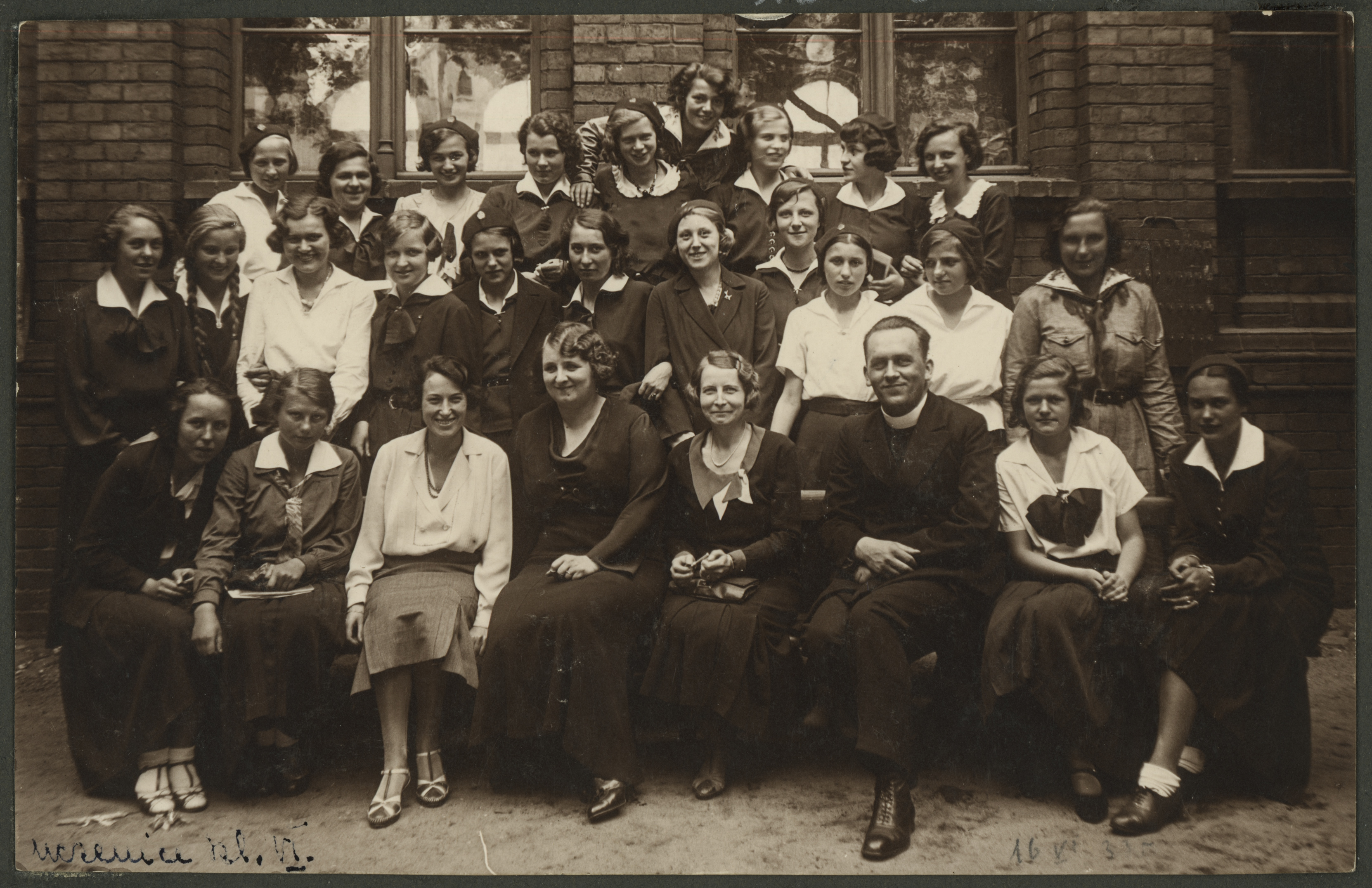 • fotografia ; portret ; mężczyzna ; ksiądz ; dziewczyna ; kobieta ; moda ; szkoła ; moda międzywojenna ; mundurek szkolny ; Gimnazjum Żeńskie w Toruniu ; Miejskie Gimnazjum Żeńskie w Toruniu
