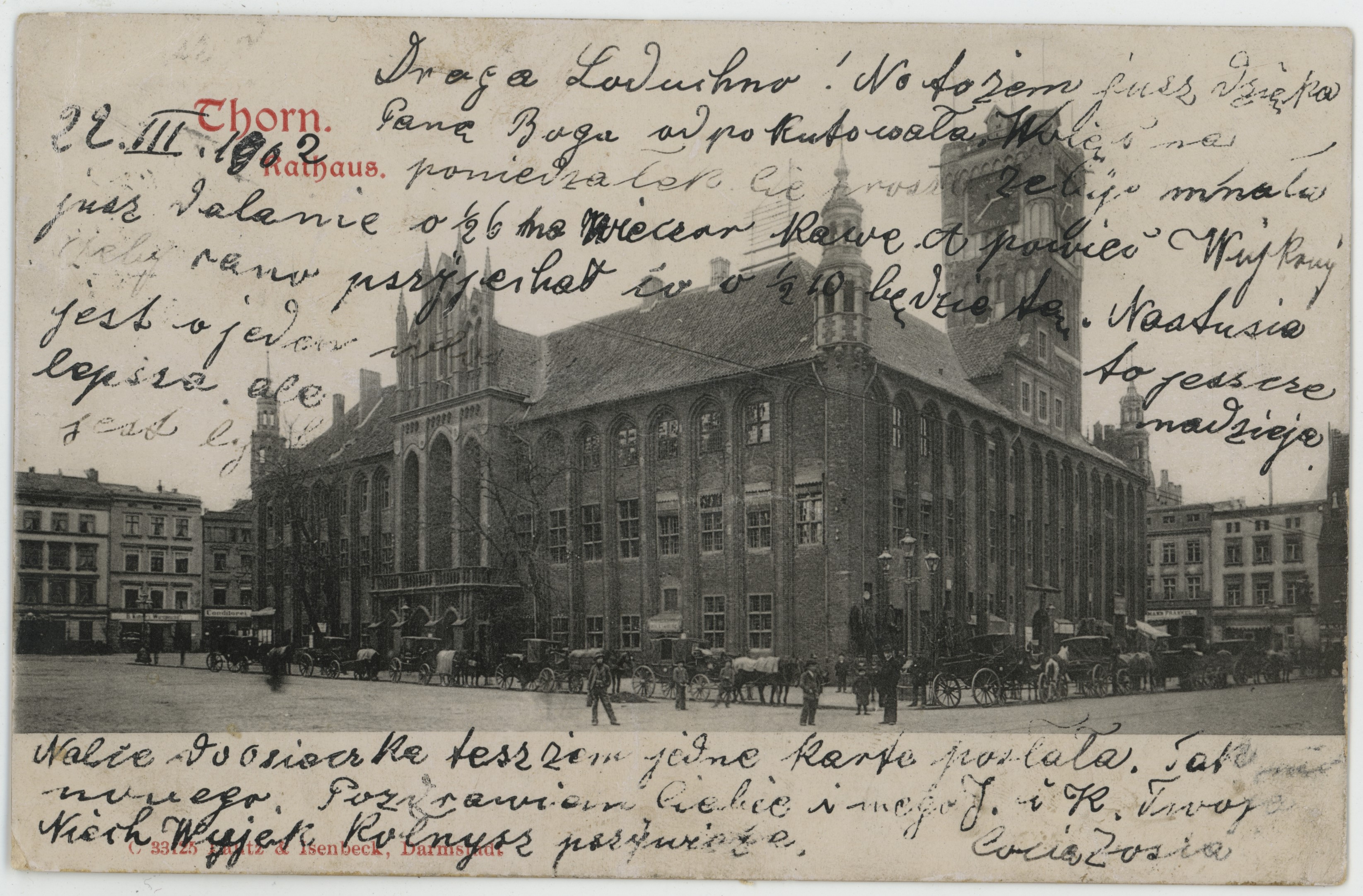 • pocztówka ; architektura ; architektura gotycka ; ratusz ; Ratusz Staromiejski w Toruniu ; Rynek Staromiejski w Toruniu ; dorożka ; miasto ; Toruń