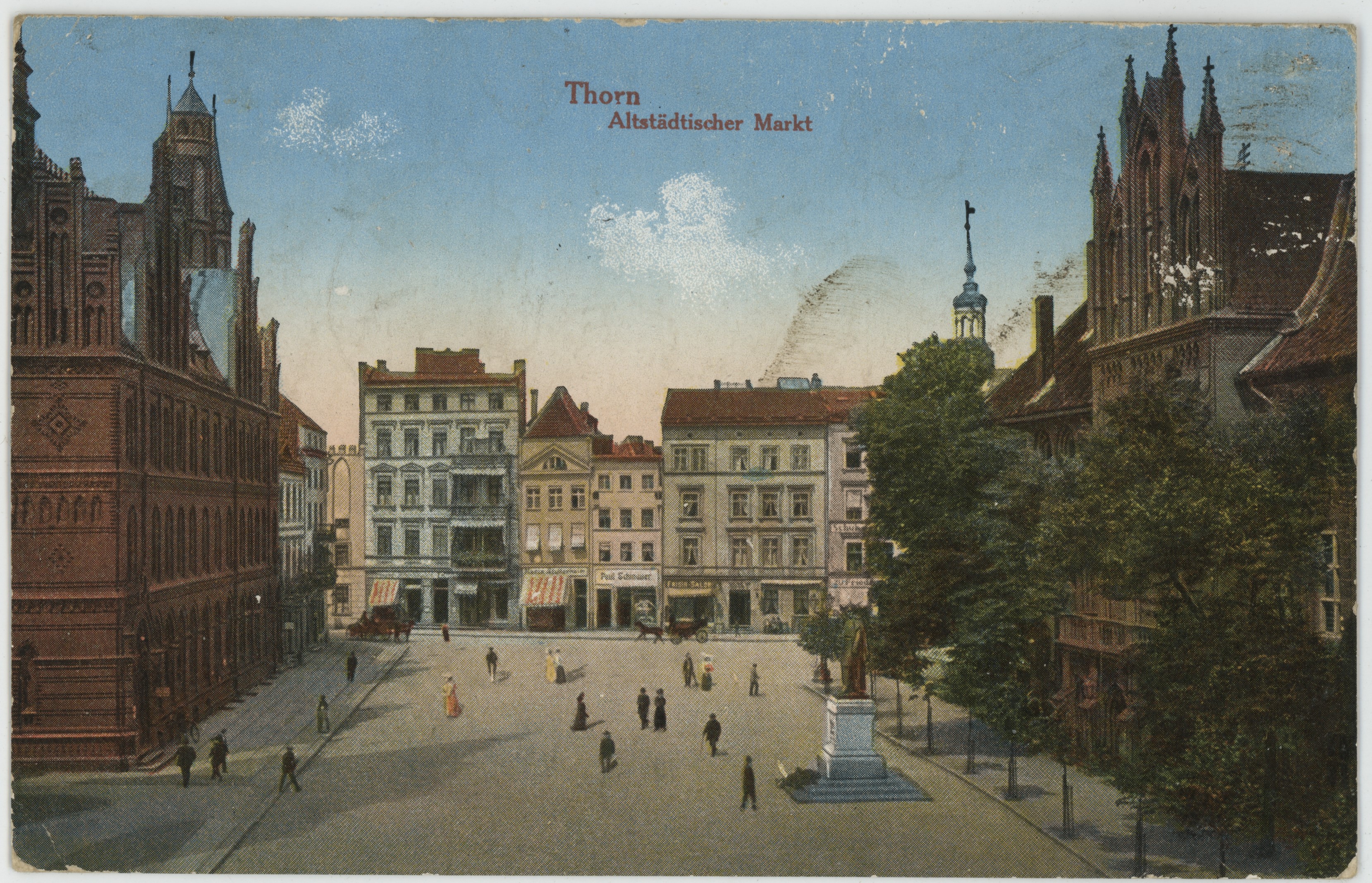 • pocztówka ; architektura ; architektura gotycka ; ratusz ; Ratusz Staromiejski w Toruniu ; Poczta Główna w Toruniu ; poczta ; kamienica ; pomnik ; pomnik cesarza Niemiec Wilhelma I Hohenzollerna ; Toruń